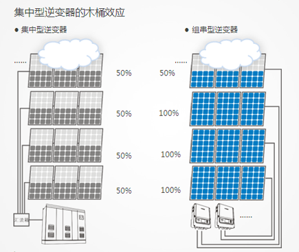 第一,避免了集中型逆變器電站的木桶效應(如下圖)。集中式并網逆變系統中,組件方陣經過兩次匯流到達逆變器,逆變器最大功率跟蹤功能(MPPT)不能監控到每一路組件的運行情況,因此不可能使每一路組件都處于最佳工作點,當有一塊組件發生故障或者被陰影遮擋,會影響整個系統的發電效率。所以當電池組件受到遮擋時,集中型電站會受到較大的影響,組串型電站只有被遮擋的一串對應的一路MPPT受到影響。而正常情況下,各個組件之間的安裝間距,安裝角度各異,一天中一定時間內不可避免會產生局部遮擋,特別是早晚時刻太陽高度角較低的時候,或者出現一些植被遮擋一些電池片。若一個500KW方陣的電池板使用一路MPPT來跟蹤,會損失一定的發電量。該情況同樣適用于當電池組件發生臟污、陰影、老化、升溫、熱斑的情況下。